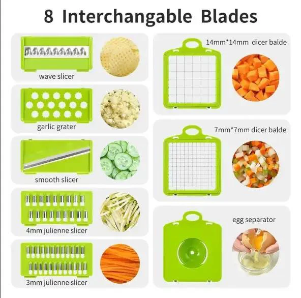 - تنوع لا محدود: تحتوي على 8 شفرات قابلة للتبديل مصنوعة من الفولاذ المقاوم للصدأ (Stainless Steel)، تتيح لكِ (التقطيع المكعب، البشر الناعم والخشن، التقطيع الشرائح، والتقطيع المتموج).