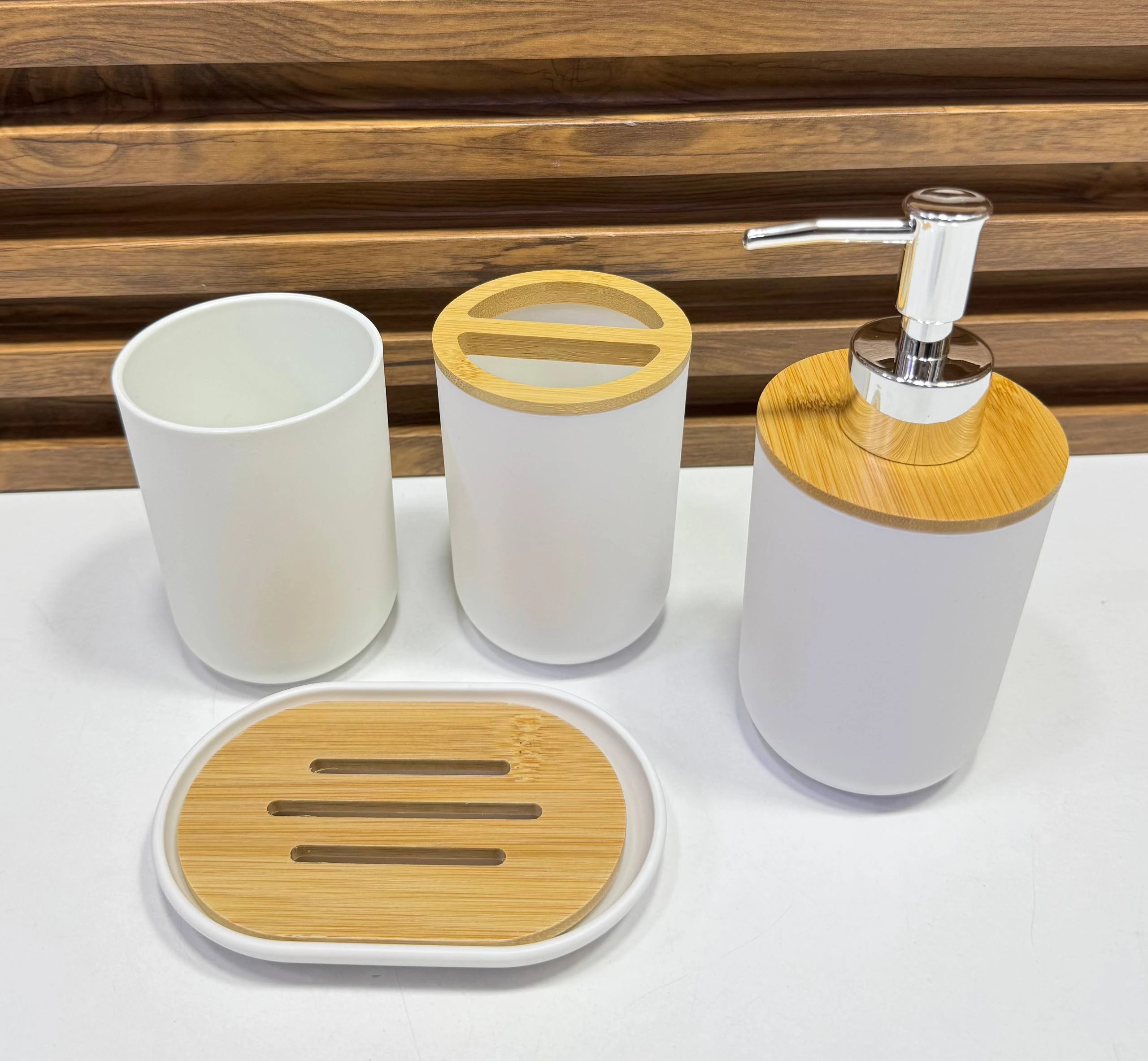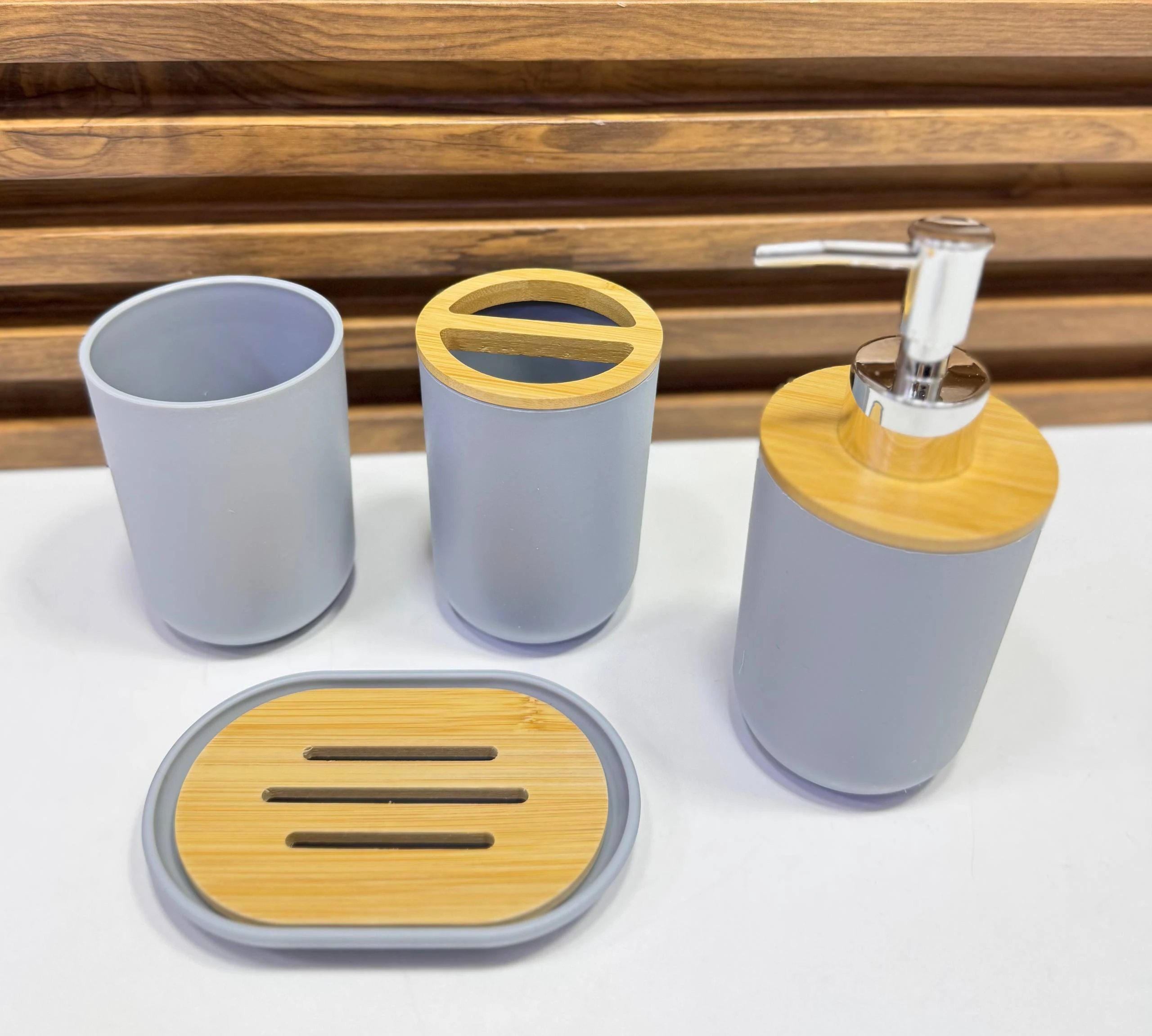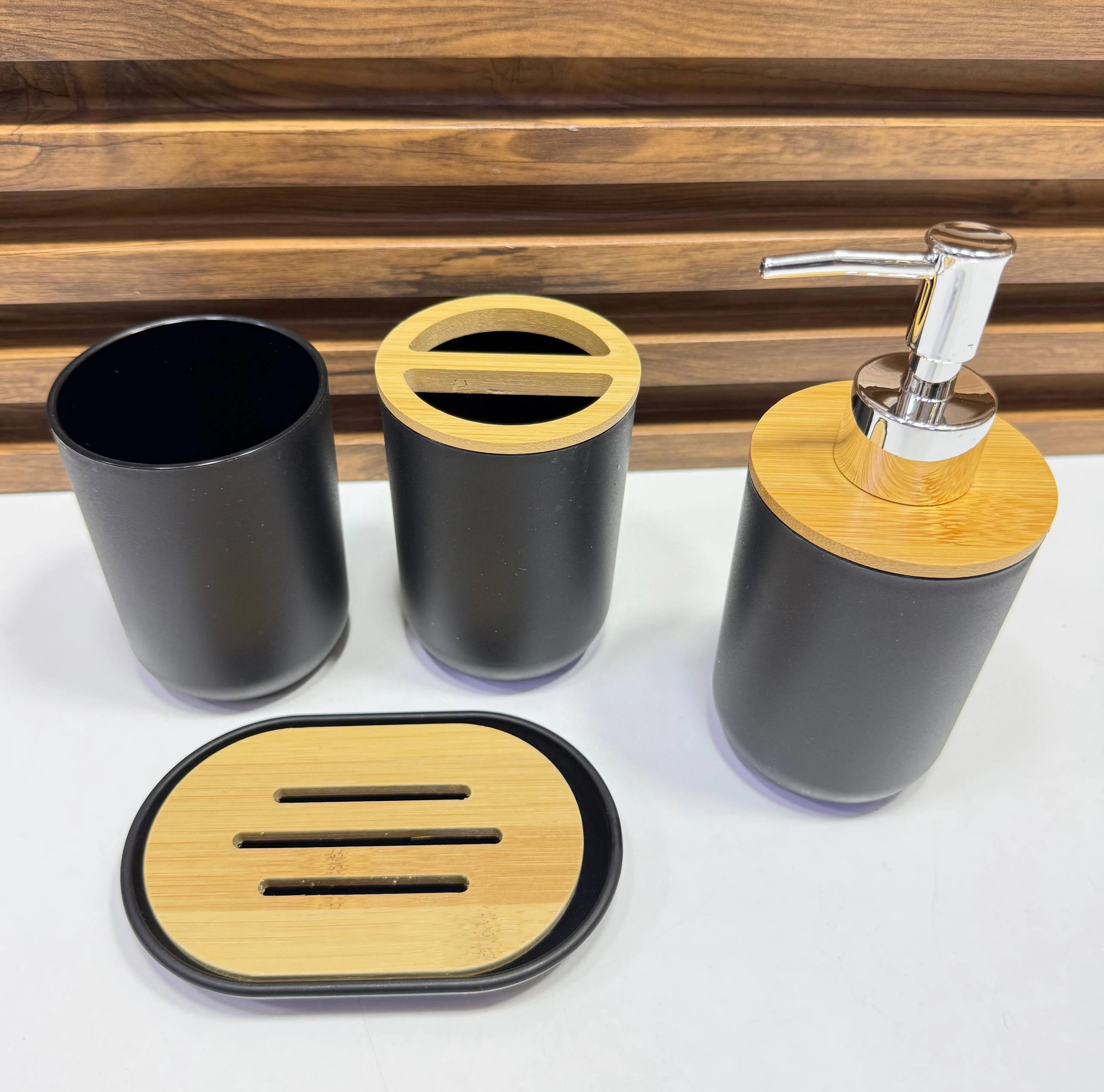 طقم إكسسوارات الحمام العصري – مزيج الفخامة والخشب الطبيعي (4 قطع)