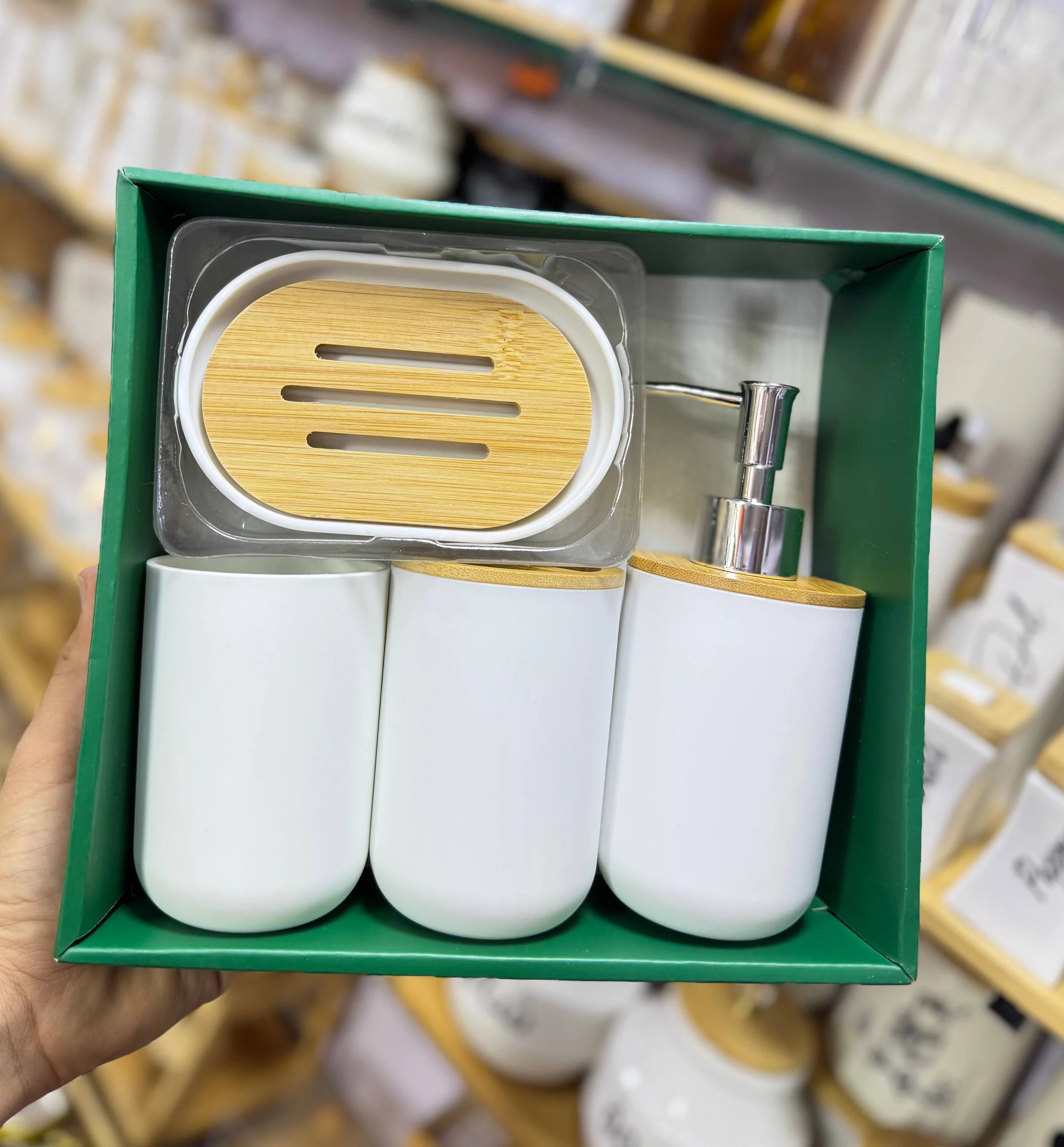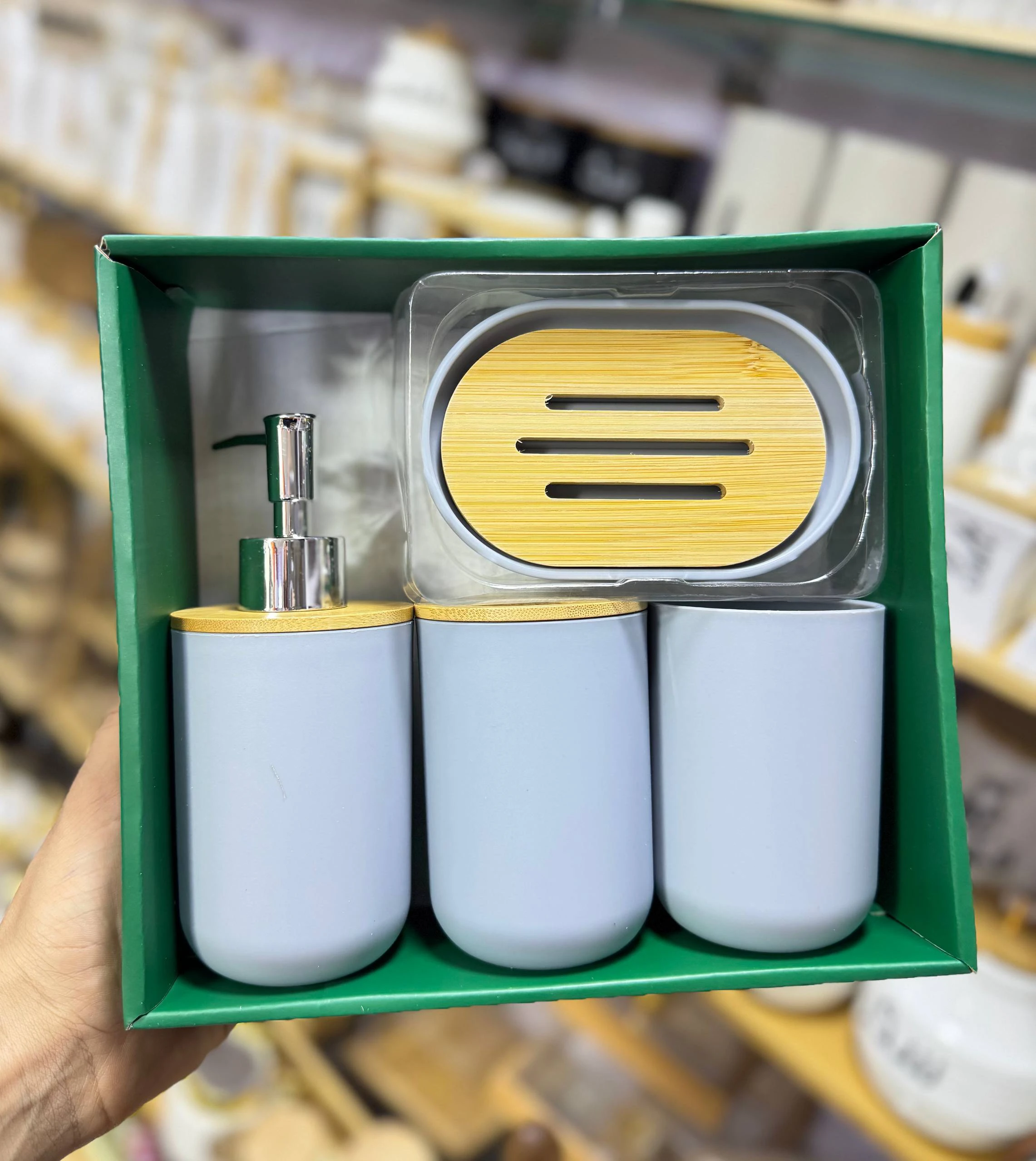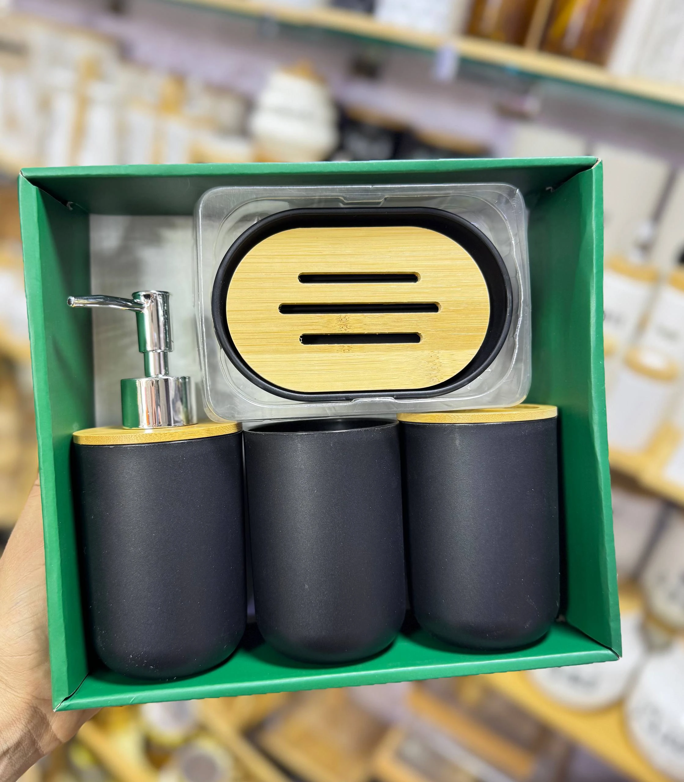 طقم إكسسوارات الحمام العصري – مزيج الفخامة والخشب الطبيعي (4 قطع)