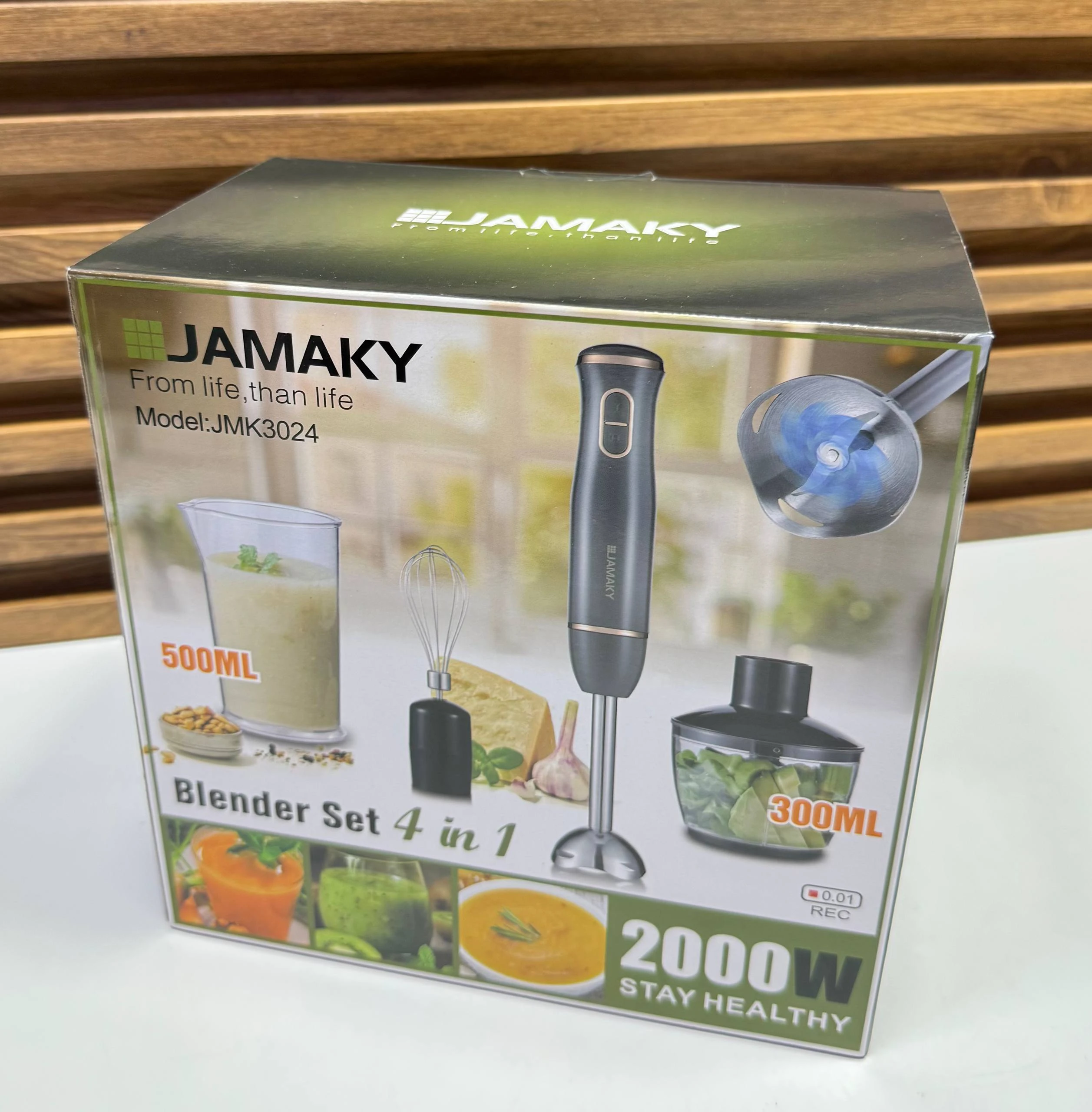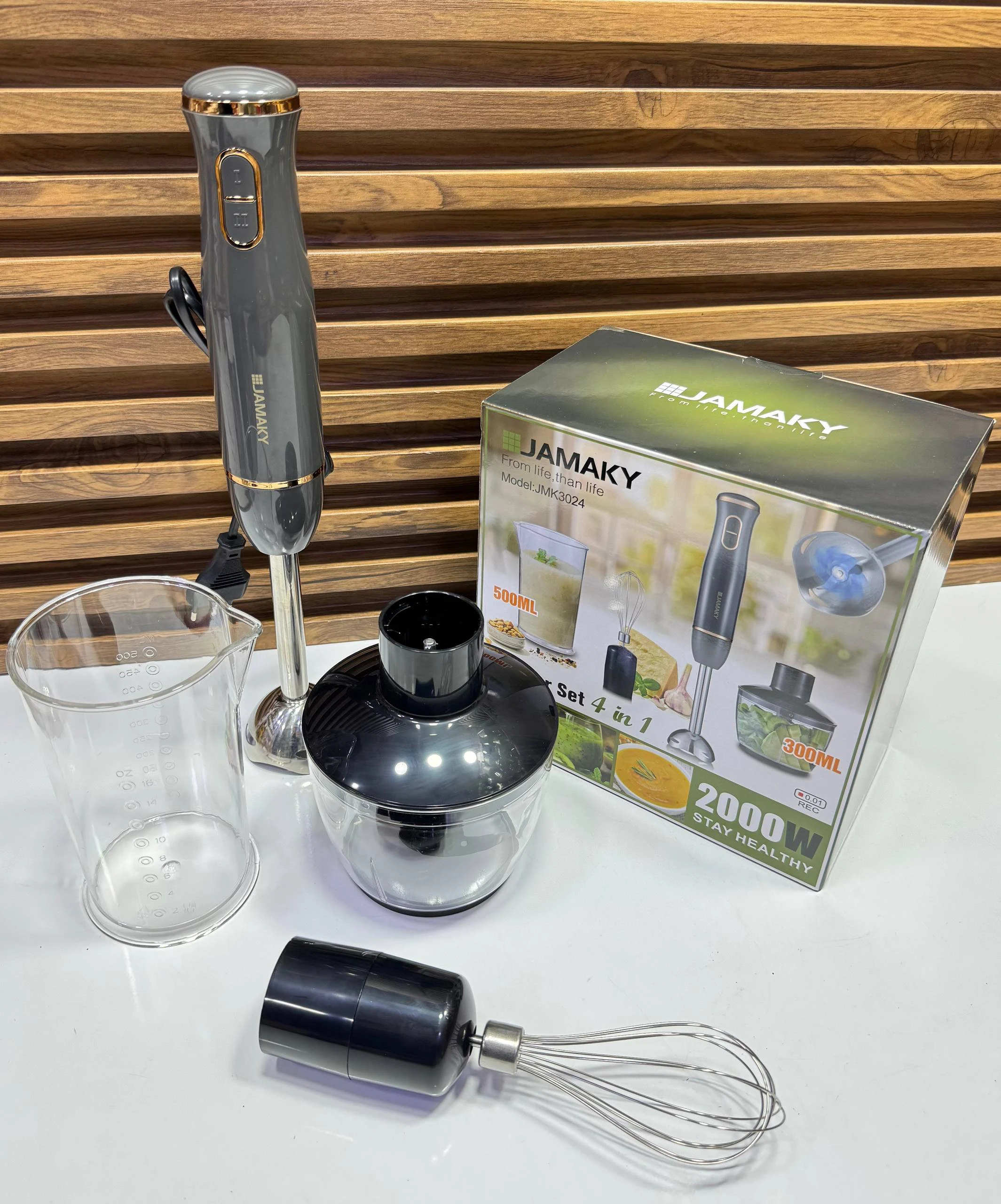 طقم خلاط جاماكي (JAMAKY) المتكامل 4 في 1يعتبر هذا الطقم أداة مثالية وعصرية لكل مطبخ، حيث يجمع بين القوة والتعدد في الاستخدام ليغنيك عن عدة أجهزة أخرى. يتميز بتصميمه الأنيق باللون الرمادي مع لمسات ذهبية جذابة. المواصفات الفنية: