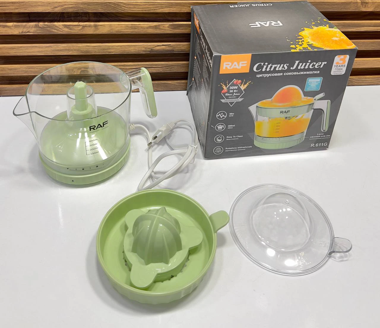 لماذا تختار عصارة RAF؟إذا كنت تبحث عن جهاز صغير الحجم لا يأخذ مساحة في المطبخ، وفي الوقت نفسه يمنحك جودة العصر اليدوي بجهد كهربائي بسيط، فإن موديل R.611 هو الخيار الأمثل. بفضل ضمانها الطويل وتصميمها المتين، تعتبر استثماراً رائعاً لنمط حياة صحي. محتويات العبوة: (القاعدة الكهربائية، وعاء العصير، مصفاة اللب القابلة للتعديل، مخروط العصر، غطاء الحماية، دليل الاستخدام).