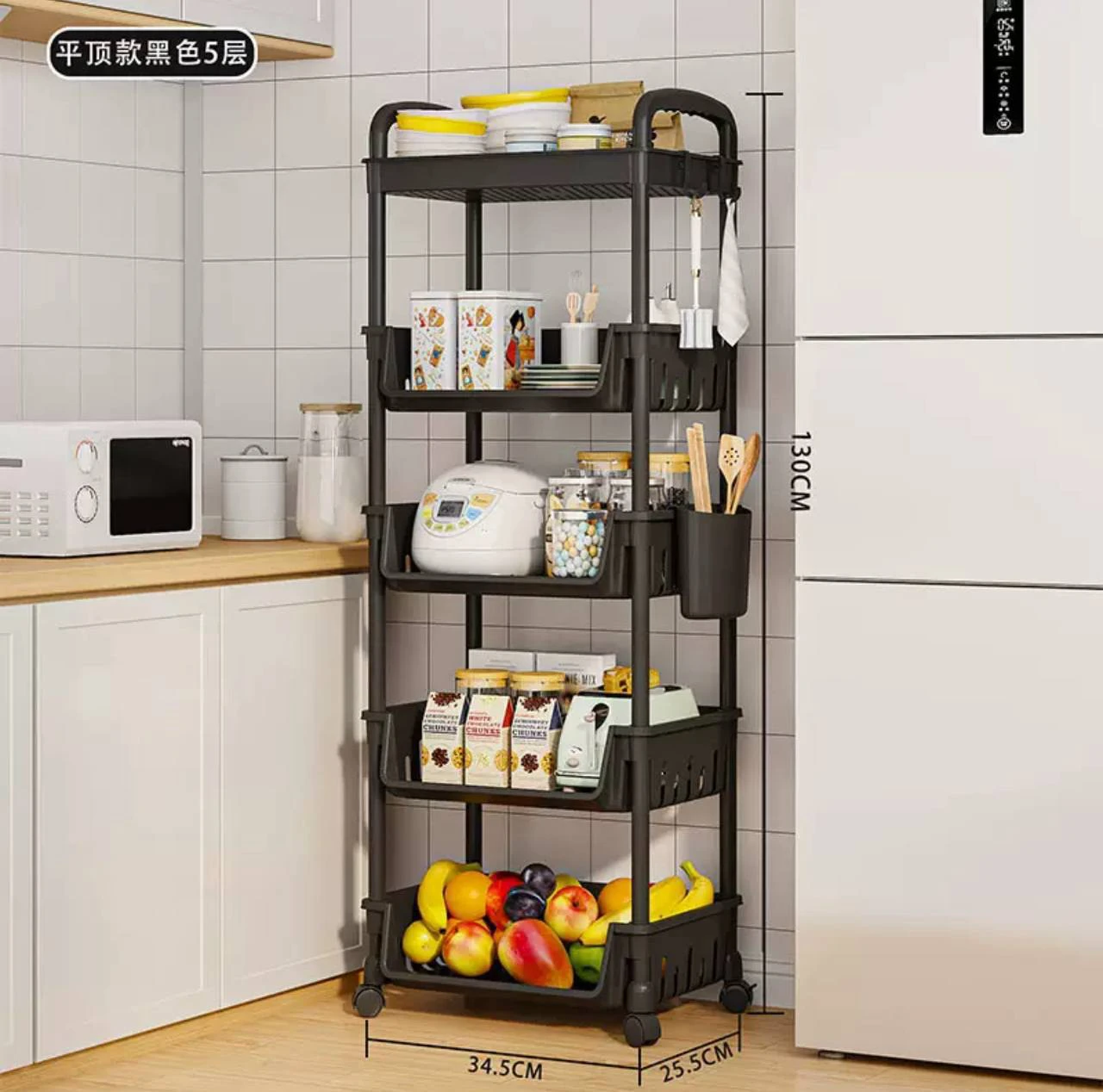 ✔️ رف تخزين بلاستيكي متين بخمس طبقات مع عجلات قابلة للتعديل، عربة متنقلة، حامل للفاكهة والخضروات
