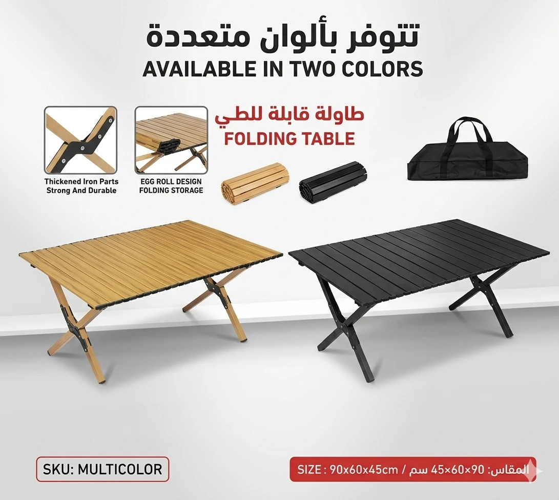 طاولة التخييم والرحلات القابلة للطي (تصميم Egg Roll)تجمع هذه الطاولة بين المتانة، والأناقة، والعملية، مما يجعلها الرفيق المثالي لرحلات البر (الكشتات)، التخييم، والحدائق المنزلية. تتميز بتصميمها الذكي الذي يسمح بطيها بالكامل لسهولة النقل والتخزين. المواصفات الفنية: