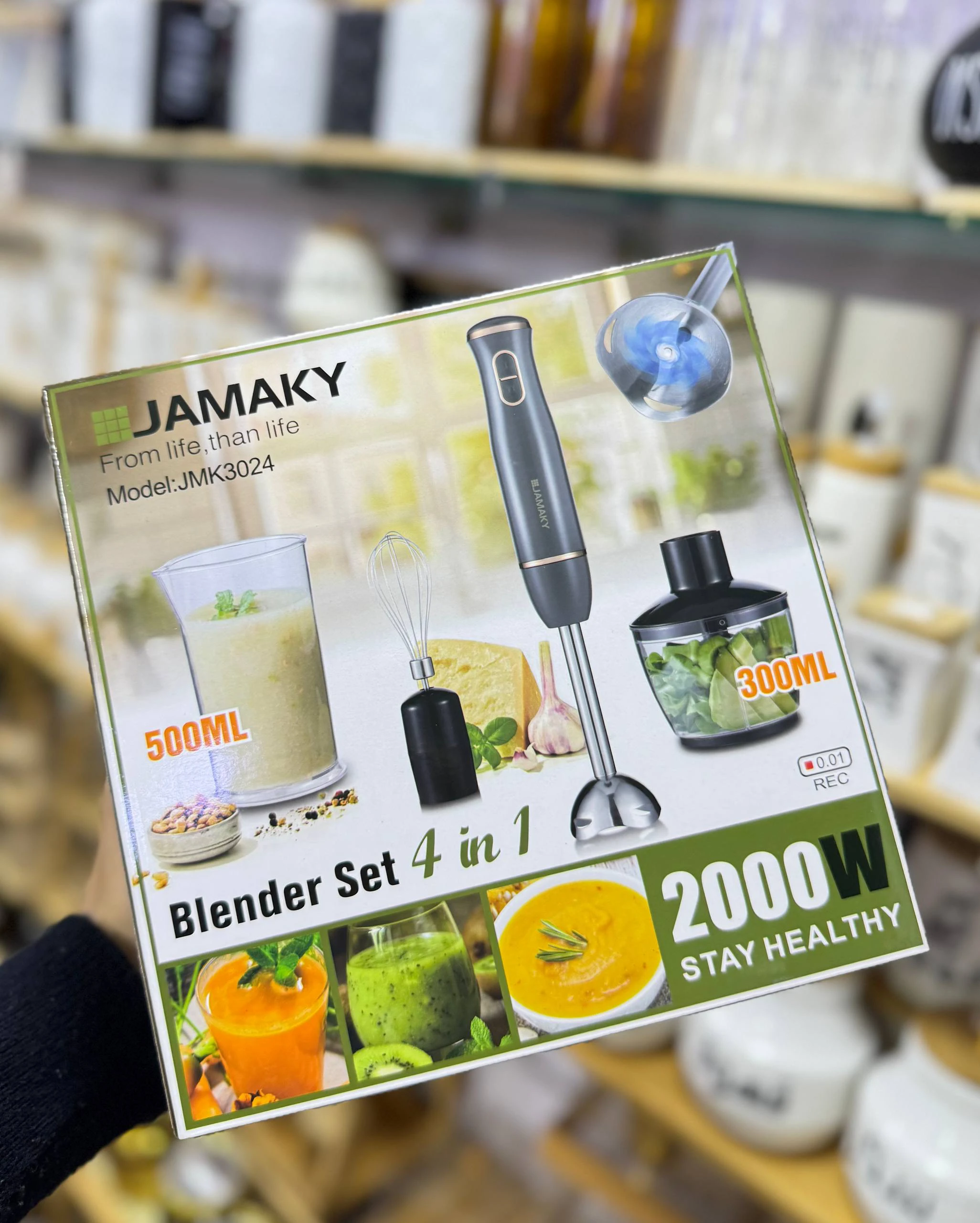 طقم خلاط جاماكي (JAMAKY) المتكامل 4 في 1يعتبر هذا الطقم أداة مثالية وعصرية لكل مطبخ، حيث يجمع بين القوة والتعدد في الاستخدام ليغنيك عن عدة أجهزة أخرى. يتميز بتصميمه الأنيق باللون الرمادي مع لمسات ذهبية جذابة. المواصفات الفنية: